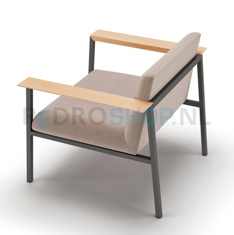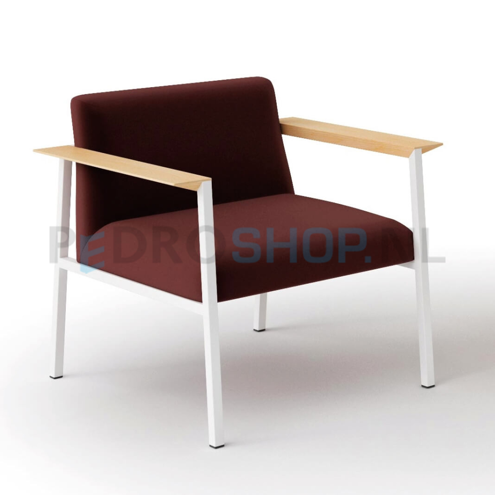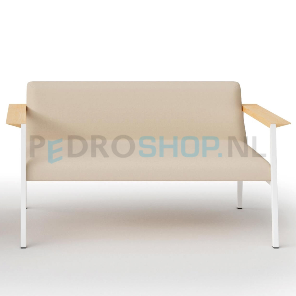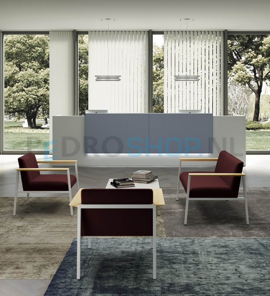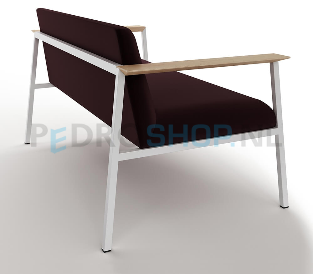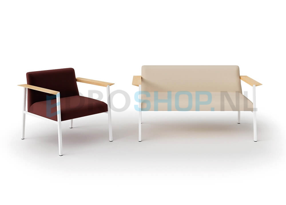 Ado kenmerkt zich door zijn ranke stalen frame met strakke houten armleggers en vele stofsoorten. Als 1 of 2 zits en tafel leverbaar.
