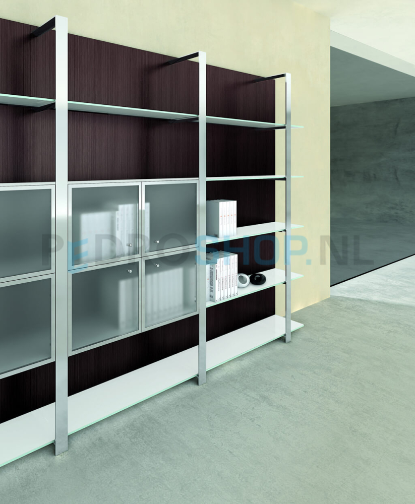 Boiserie kasten zijn leverbaar in 2 hoogtes (135 en 219cm) en modulair uit te breiden. De kast bestaat uit een 18mm dikke achterwand met metalen staanders in shadow grey, gepolijst aluminium, mat wit of glossy wit. De planken zijn uitgevoerd in dubbel gecoat wit glas en kunnen eenvoudig aangevuld worden met diverse deuren en afsluitpanelen. Hierdoor creëert u zelf eenvoudig de ideale kast voor uw ruimte!