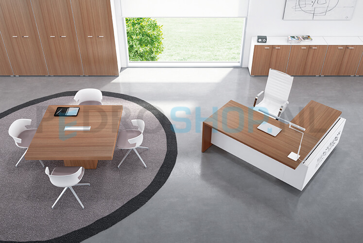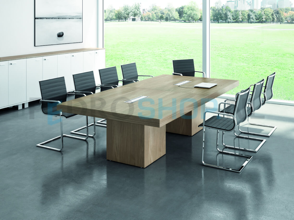T45 meeting tafels met de kenmerkende dikke rand (85mm) leverbaar in diverse kleuren en met 2 verschillende onderstellen. Bladen inclusief 2-zijdig te openen kabeldoorvoerklep 45x12cm en kabelbak.