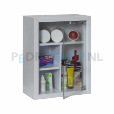 Deze medicijnkast is geschikt voor het overzichtelijk opbergen van medicijnen. Dit type is zowel met een metalen als met een transparante glazen deur leverbaar. Het kastje heeft een vaste vakverdeling en is uitgevoerd met een cilindersleutelslot met 2 sleutels.