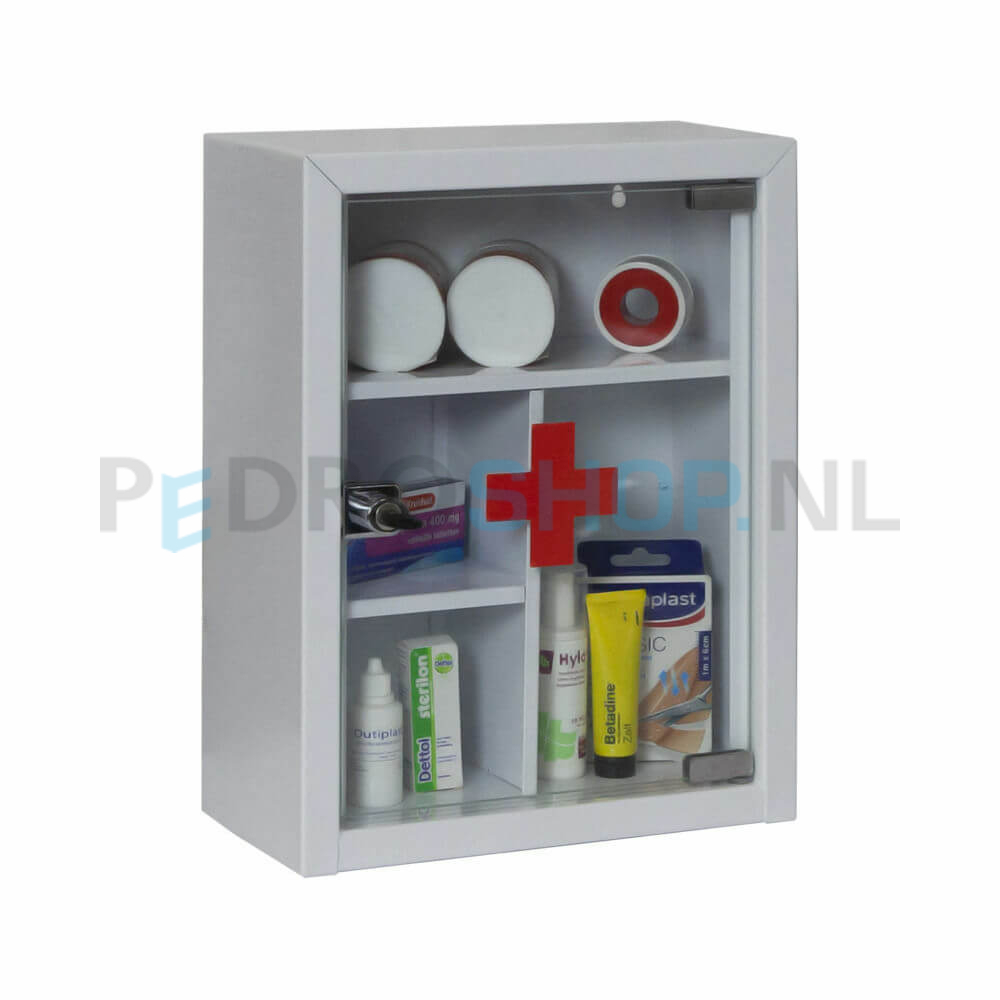Deze medicijnkast is geschikt voor het overzichtelijk opbergen van medicijnen. Dit type is zowel met een metalen als met een transparante glazen deur leverbaar. Het kastje heeft een vaste vakverdeling en is uitgevoerd met een cilindersleutelslot met 2 sleutels.