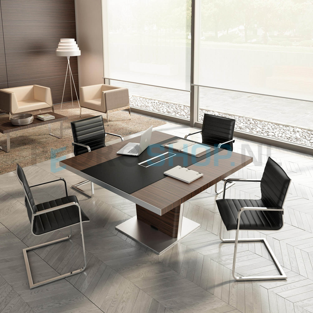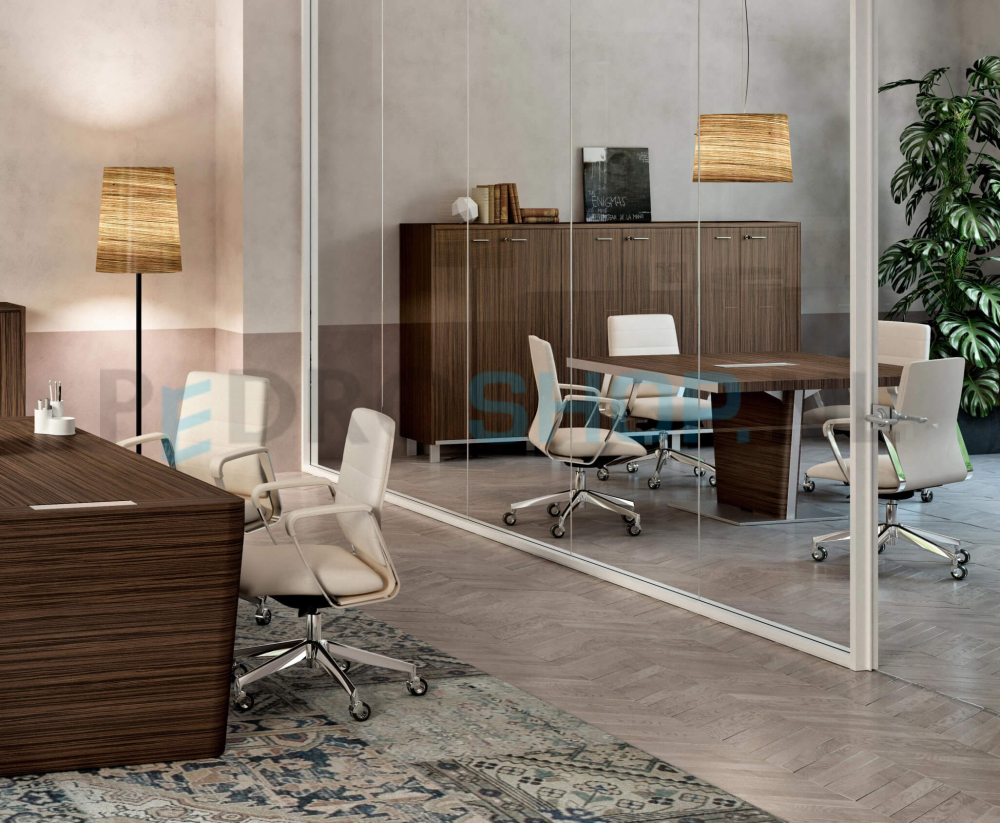De exclusieve management-lijn X8 van het Italiaanse Officity, strak en puur design. Massief aluminium frames in mat wit of mat donkergrijs (shadow grey) met 10mm dunne geprofileerde bladen van melamine, glas of gelakt hout.