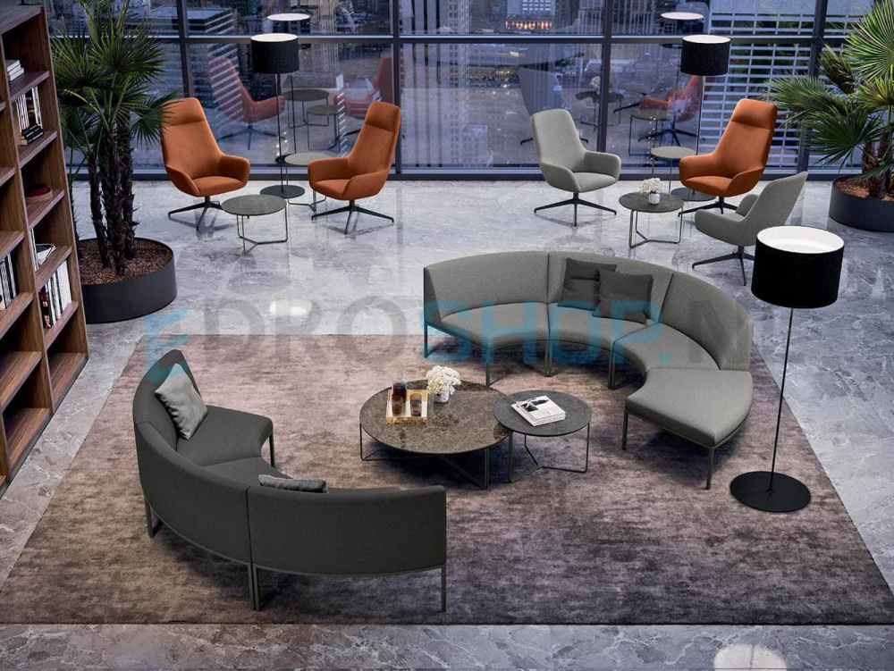Maak uw ontvangstruimte extra aantrekkelijk met de praktische Astro modules van het Italiaanse Quadrifoglio. Keuze uit vierkant of gebogen zitelementen uitgevoerd in comfortabel en vormvast koudschuim op duurzaam berken multiplex met een metalen frame. Hier en daar een bijpassend tafeltje en de ruimte is klaar om uw gasten te verwelkomen. Leverbaar in 4 kleuren metalen frames en een scala aan stof- en lederkleuren voor de zitjes. De tafels zijn voorzien van hetzelfde frame met een 30mm dik krasvast wit melamine topblad.