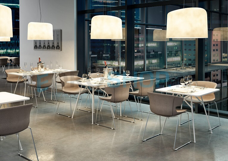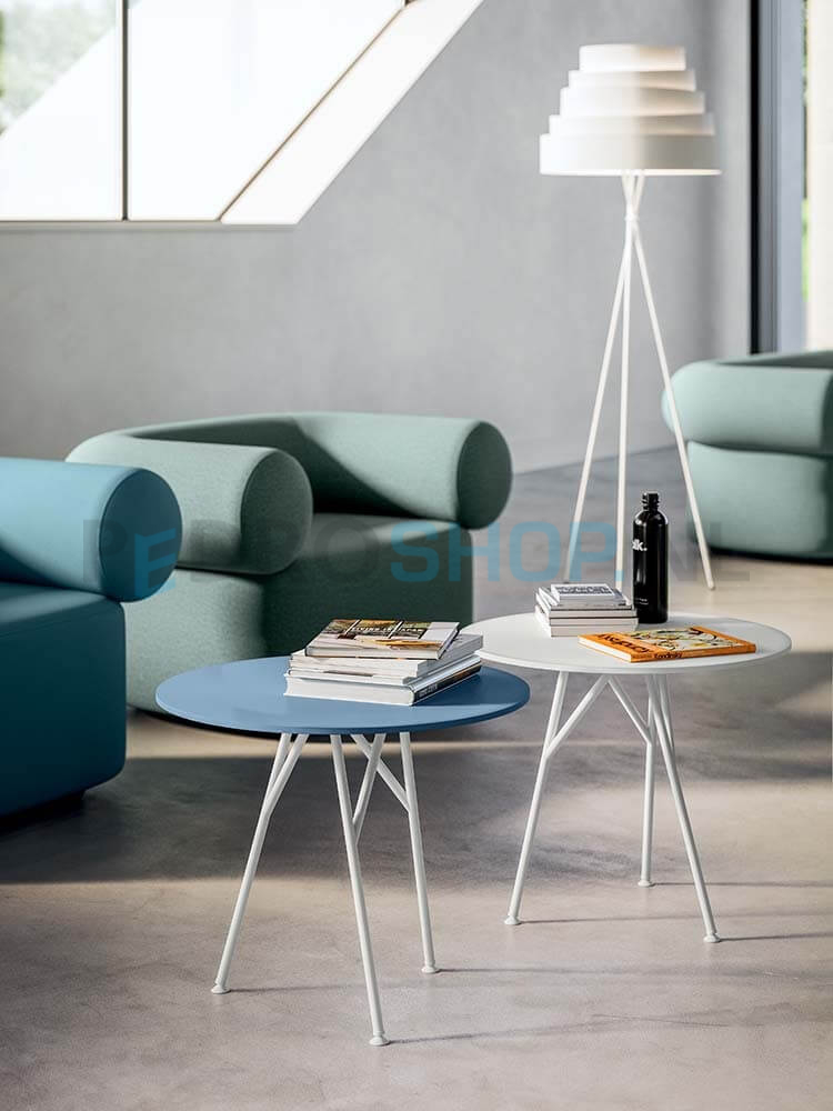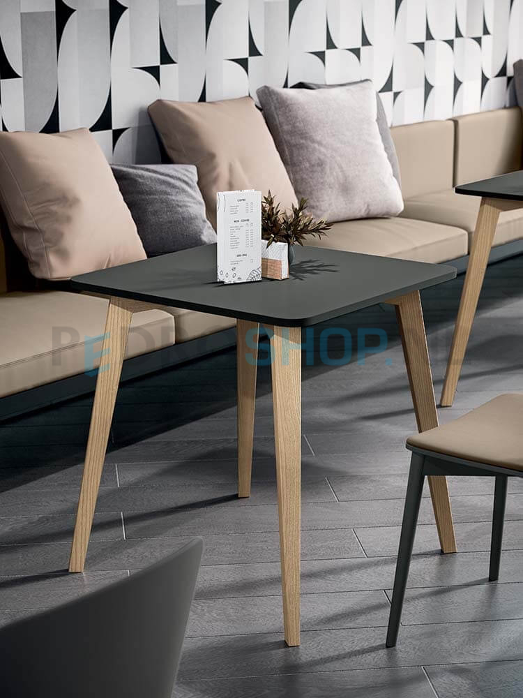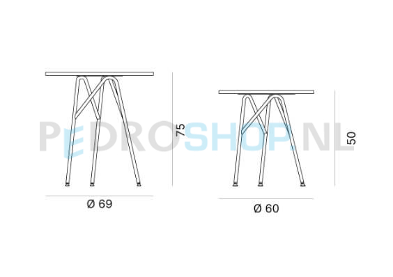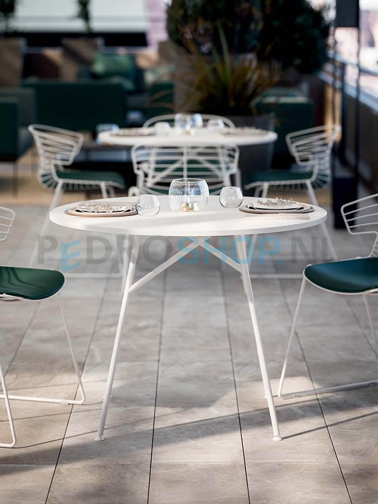 Tafels met metalen of houten pootjes en bladen in 18mm melamine of 10mm volkern.