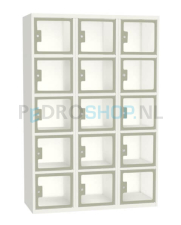 De SQ Classic 15-deurs lockerkast met transparante deuren. SQ kent een uitgebreid assortiment aan lockerkasten en zijn naar eigen wens samen te stellen. Opties uit verschillende kleuren deuren en ombouw. Deze lockerkast kent voor de deuren de kleurcode: Kiezelgrijs Ral 7032 en voor de ombouw: Wit Ral 9010.