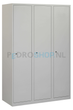 De garderobekast is ideaal voor ruimtes waar schone en vuile kleding, of privé- en werkkleding, strikt gescheiden moeten worden opgeborgen. Deze kast bestaat uit drie kolommen, elk met een eigen deur en een verdeelschot dat het vak in twee aparte compartimenten verdeelt. Bovenin elke kolom bevindt zich een legbord, met daaronder aan beide zijden van het verdeelschot een kledingstang met haken. Dit zorgt voor een georganiseerde, hygiënische en overzichtelijke opbergstructuur voor iedere gebruiker.