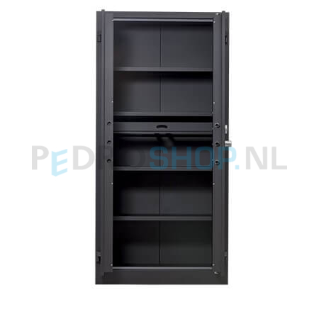 De kast is uitgevoerd met een dubbelbaard veiligheidsslot met 2 sleutels. De deuren zijn 5 zijdig sluitend door middel van zware slotschoten.