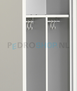 De PDC-T210 garderobekast is ideaal voor het scheiden van schone en vuile kleding, of voor het gescheiden opbergen van privé- en werkkleding. Achter de enkele deur bevindt zich een praktische schoon/vuil indeling met een scheidingswand, een legbord en aan beide zijden een kledingstang met haken.