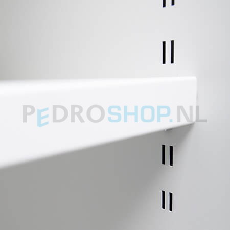 De kast is afgewerkt met een krasvaste poedercoating. Bij deze schuifdeurkast leveren we 4 legborden, 2 voor beide zijden. De legborden zijn geschikt voor opbergen van laterale hangmappen met een spoorbreedte van 33 cm. Om de 2 cm kent de kast de mogelijkheid om het legbord te plaatsen. De legborden kunnen een maximaal verdeeld gewicht dragen van 60 kg.