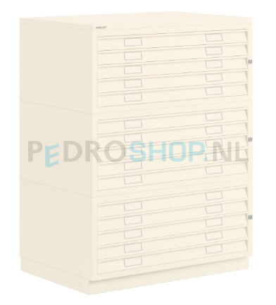Deze Bisley tekeningkast bestaat uit drie elementen van ieder 5 laden. Het onderste element kent een sokkel. Het bovenste element kent een metalen top.