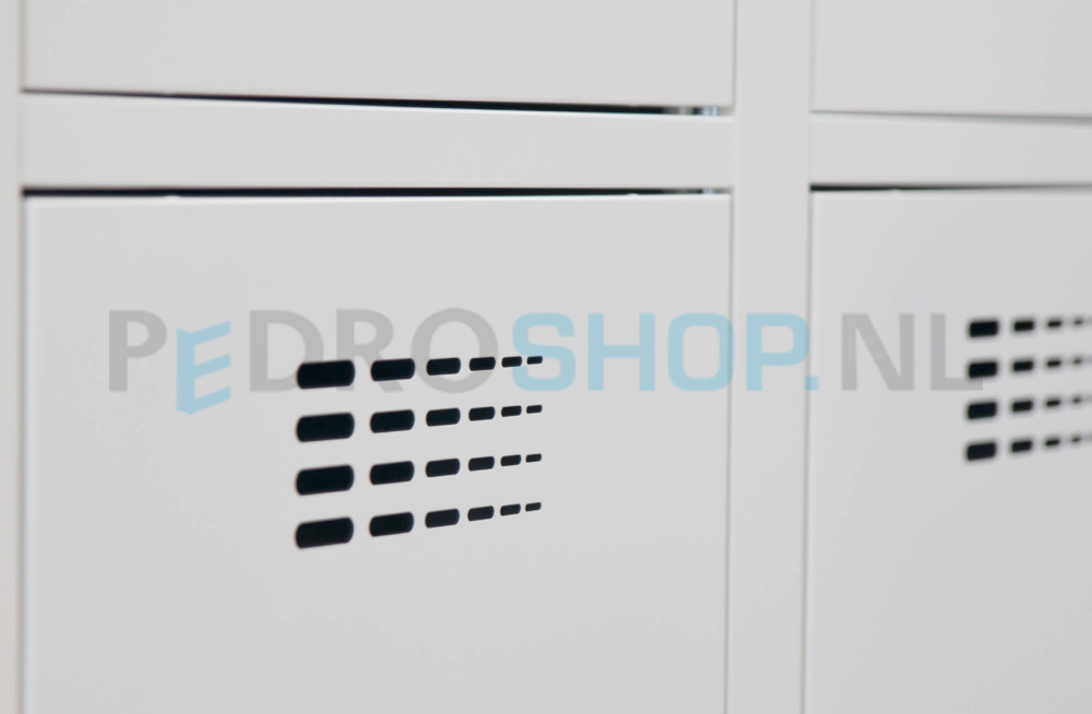 De deuren van deze garderobekast zijn voorzien van perforatiesleuven voor optimale ventilatie. Alle deuren zijn rechtsdraaiend en openen soepel dankzij de degelijke scharnieren. Iedere kolom is uitgerust met een kledingstang met haken, zodat kleding en accessoires overzichtelijk kunnen worden opgeborgen.