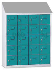 Met een afmeting van h109 x b81 x d30 cm biedt de kast voldoende ruimte voor 20 mini lockers, verdeeld over 4 kolommen met ieder 5 lockers. Elke locker heeft een afmeting van h16 x b15 x d27 cm.